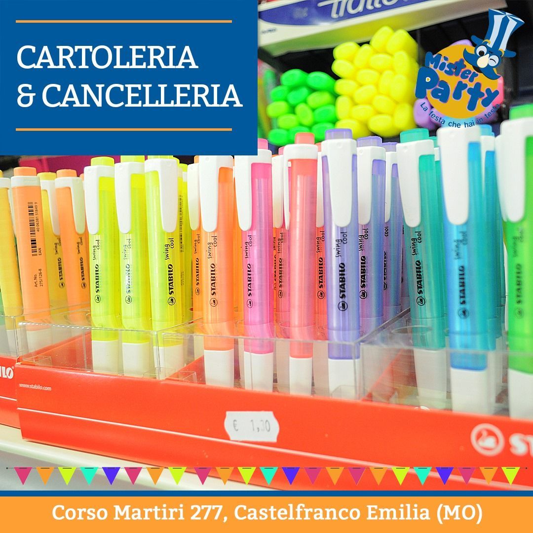 Da Mister Party trovi un mondo di idee e colori! Offriamo una vasta selezione di cartolibreria, con articoli per la scuola, l’ufficio e il tempo libero, sempre aggiornati e di qualità. Scopri anche i nostri articoli da regalo originali, pensati per sorprendere in ogni occasione, dai compleanni agli eventi speciali.